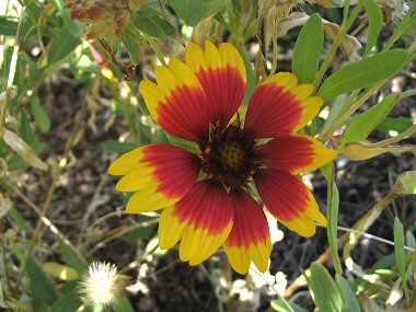 sunflower-like bloom, in which each of the 3 lobed petals are reddish