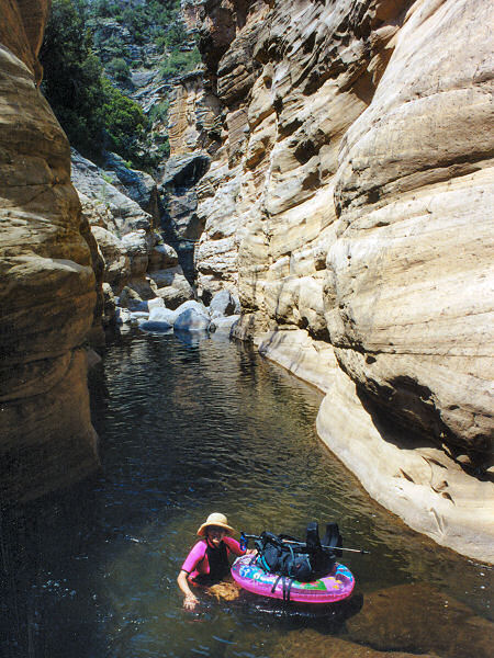 Day 1: From the parking area at the end of FR 142A follow the steep path that leads over the edge of the hill down to the stream bed (there is a tent site right at the bottom). Begin hiking down stream. Most of the time you will be hopping rocks and pushing through brush along the side of the stream, occasionally crossing to find easier walking on the other side. The canyon is fairly wide in this section and not particularly interesting. After about two hours of walking the scenery changes: the walls close in and some nice Coconino sandstone narrows form (Williams {see book reference below} refers to this section as the White Box). You will reach your first of many mandatory swims in this segment. The next few miles of this hike are very nice with the canyon occasionally widening then narrowing to form picturesque narrows. Eventually the rock walls widen somewhat, giving you a rest from the pools as the stream cuts deeper into redder sandstone. After a while some nice (if short) red sandstone narrows are formed. The author and his wife camped on a bench just short of completing these narrows after a total walk time of 9.5 hours.