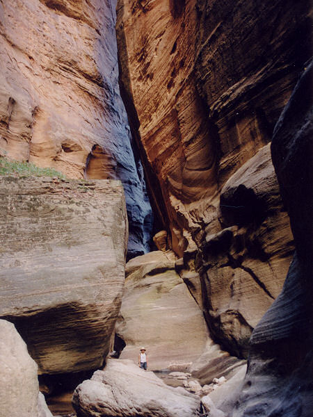 A technical canyon with about a dozen rappels, including a long 300 footer to start things off. Some nice narrows and an arch can be seen before dropping into Orderville Canyon to see the very pretty lower section. To complete this canyon you will need: 2 x 60 meter ropes, harness w/ descending gear, ascending gear, webbing, helmet and a permit (available at the Backcountry Desk in the Visitors Center). You may also wish to bring a wet suit in cooler weather, since there is deep wading and possibly swimming involved in lower Orderville Canyon. Leave the bolt kit at home, this canyon is already over bolted. Do not attempt this canyon if heavy rains threaten. |